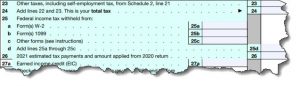 You’ll find your total tax for 2021 on line 24 of the Form 1040. Notice, too, that line 26 asks for 2021 estimated tax payments.